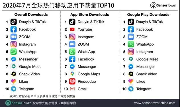 據(jù)Sensor Tower商店情報(bào)數(shù)據(jù)顯示,2020年7月,抖音及海外版TikTok以超過6520萬次下載量,繼續(xù)位列*移動(dòng)應(yīng)用(非游戲)下載榜*。