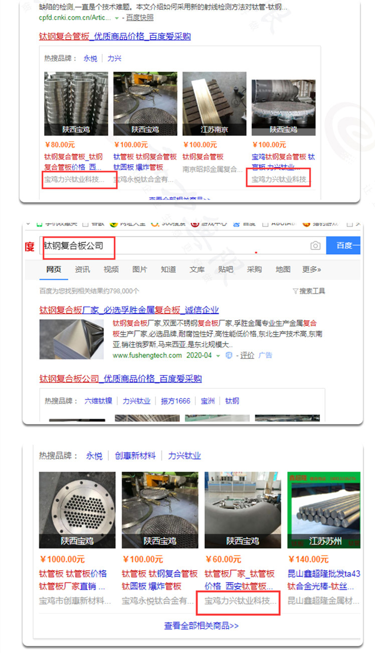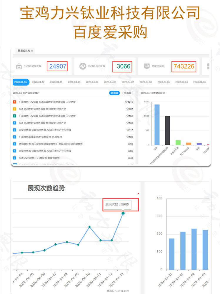 近15天內(nèi),曝光度為24907次,點擊數(shù)達(dá)到3066次;在關(guān)鍵詞搜索中,寶雞力興鈦業(yè)科技有限公司的“鈦合金梯子”、“TA2工業(yè)鈦板”、“鈦鋼復(fù)合管板”、“大型鈦換熱器”等,排在*位。