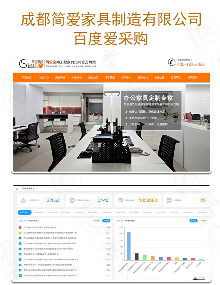 在關(guān)鍵詞搜索中,成都簡愛家居制造有限公司的“酒店家居床頭定制”,排在第二位;“成都酒店家具”排在第四位。