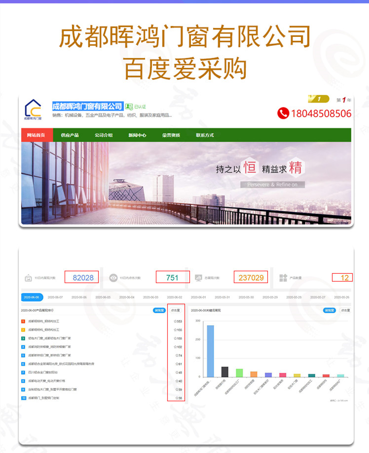 成都暉鴻門窗有限公司,這一個月以來,百度愛采購的總展現(xiàn)次數(shù)為237029次,近15天內(nèi),曝光度高達(dá)82028次,點擊數(shù)達(dá)到751次。