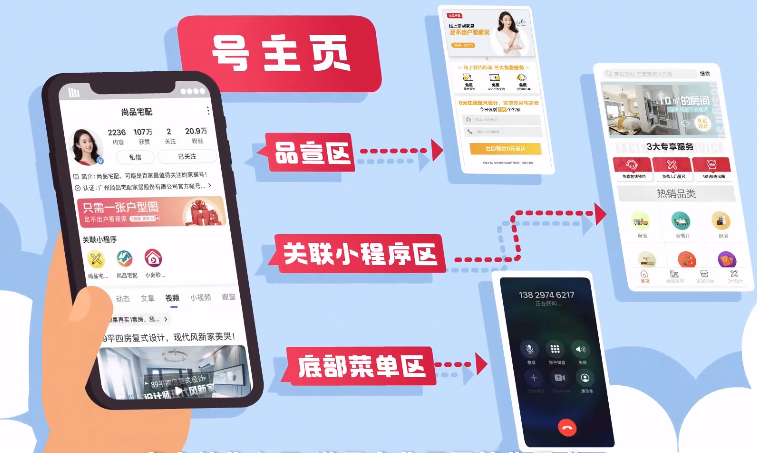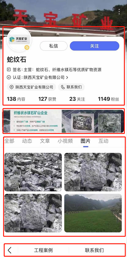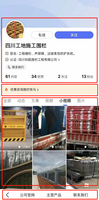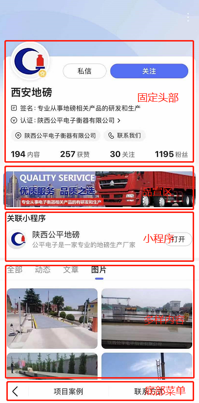 企業(yè)百家號(hào)主頁分5大模塊:固定頭部、品宣區(qū)、小程序、多樣內(nèi)容、底部菜單。