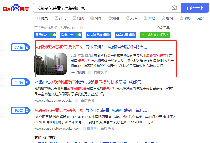 投放1條視頻,百度效果次數(shù)6條,成都氫氣提純技術、成都氫氣提純、成都氣體干燥劑等詞均已在百度展現(xiàn),讓潛在客戶能輕松實現(xiàn)對企業(yè)核心競爭優(yōu)勢的*了解。