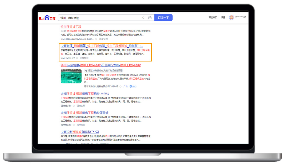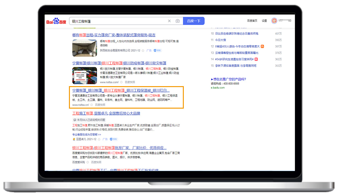 龍通晟世網(wǎng)站上線20天左右,就成功被搜索引擎收錄,而且關(guān)鍵詞:銀川工程帳篷、銀川工程保溫被、銀川紅白喜事帳篷等,均在百度首頁(yè)展示。